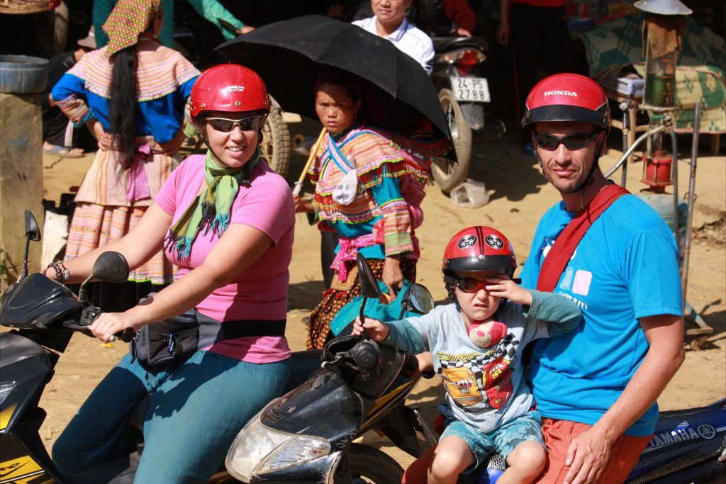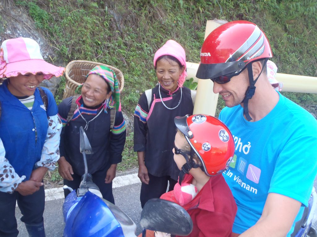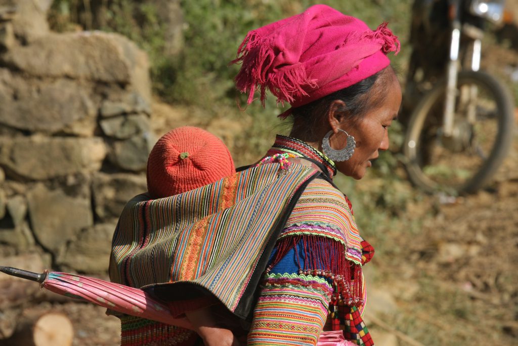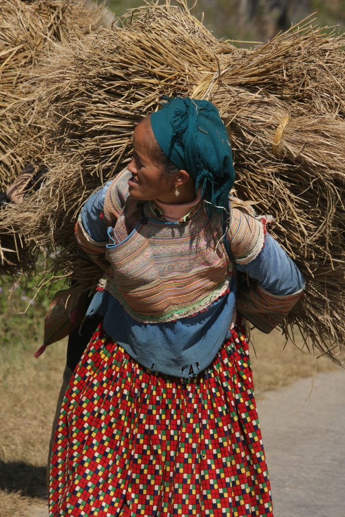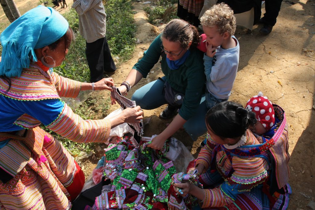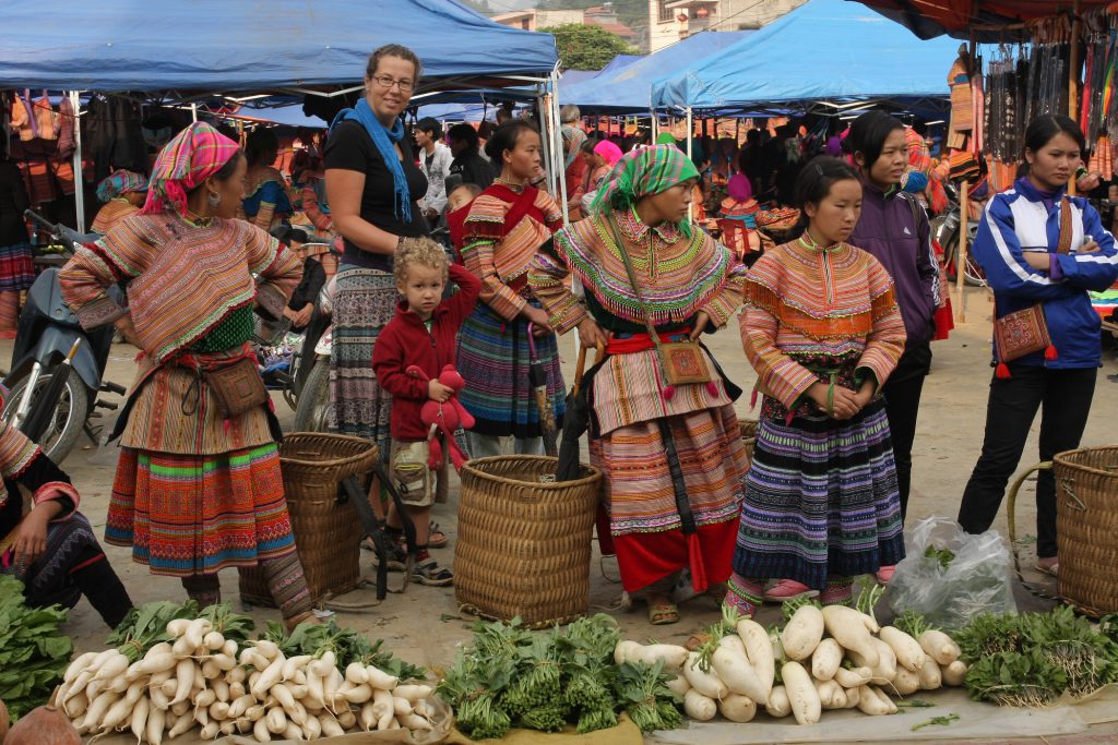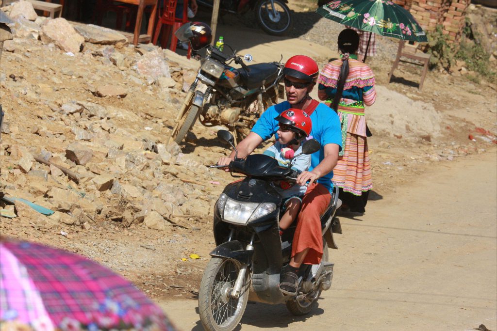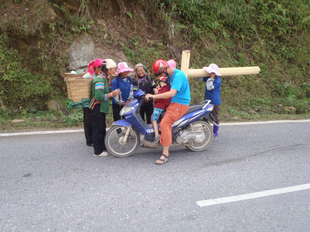 Het is koud op de brommer in de bergen, maar alleen Simeon heeft nog een trui. Wij hebben onze warme spullen al in Maleisië op de post naar huis gedaan en zijn te krenterig om voor een paar dagen een nieuwe trui te kopen. In de straten loopt iedereen met truien en winterjassen, en wij doen het met een T-shirt en een doek. Het motorrijden is heerlijk in deze mooie omgeving en ook Els, wiens rijervaring zich vooral beperkt tot veel achterop zitten en een aantal motorrijlessen geniet van het rijden over de bochtige wegen. Voorzichtig in de bochten en ook in haar tempo kom je er wel. Het is prachtig onderweg. Er gaan brommers richting markt, en er komen brommers alweer terug. Een varken moet even van de brommer af, en erna weer goed vastmaken. Een arend is gekocht, en een soort marmot en een mobiele telefoon. Het wordt steeds drukker met kleurige minderheden, en een enkele toerist en dan zijn we bij de markt van Can Cau. Vogels en koeien kopen is mannenwerk, de vrouwen kopen nieuwe rokken, nieuwe geborduurde kragen en beenstukken en velours stoffen met de felste kleuren. De baby’s zitten is meerdere schitterende doeken gewikkeld op de ruggen van de vrouwen. We genieten van dit kleurrijke spektakel. Dit is waar we in Noord Thailand naar opzoek waren maar dat kan je daar niet meer vinden. Het is al warmer geworden, en op de weg terug is er dan meer tijd om wat onverharde zijweggetjes te nemen. Deze weggetjes leiden naar een dorpje dat iets van de hoofdweg afzit. Niet iedereen rijdt op een brommer rond. Er lopen ook minderheden families langs de kant van de weg met grote stappels takken op hun rug. Als er op een brommer normaal plek is voor 5, kan de jongste met zijn takken wel een stukje met Arjan en Simeon meerijden. Waar we hem weer afzetten kan hij weer een half uurtje rusten voordat de rest er weer is.