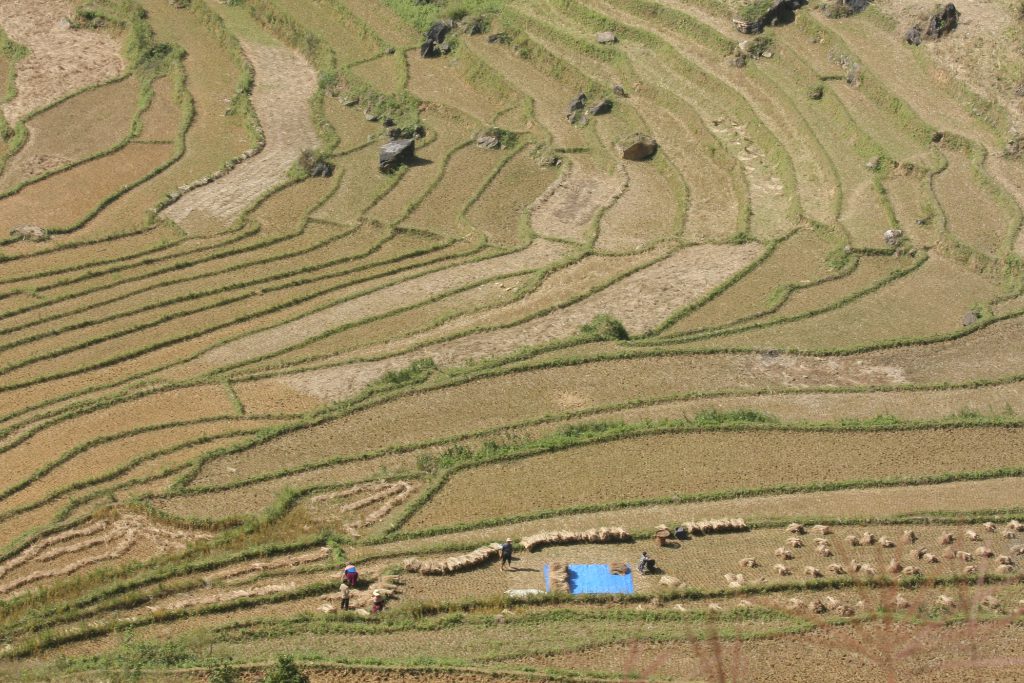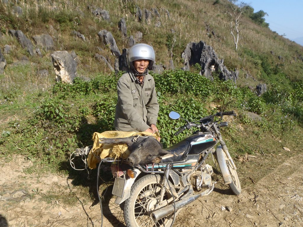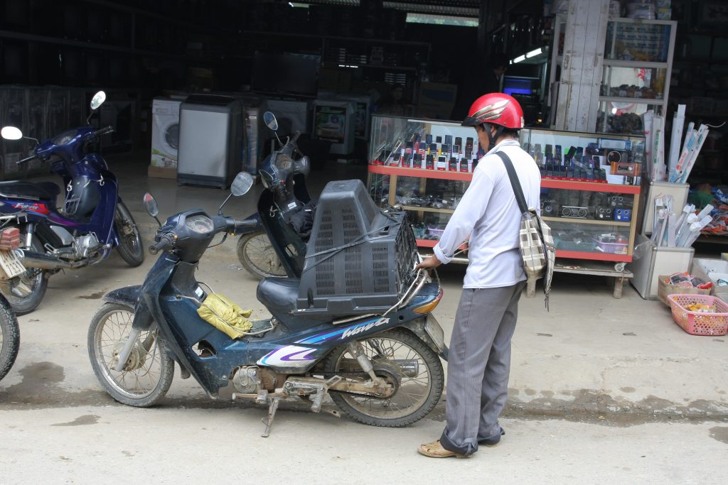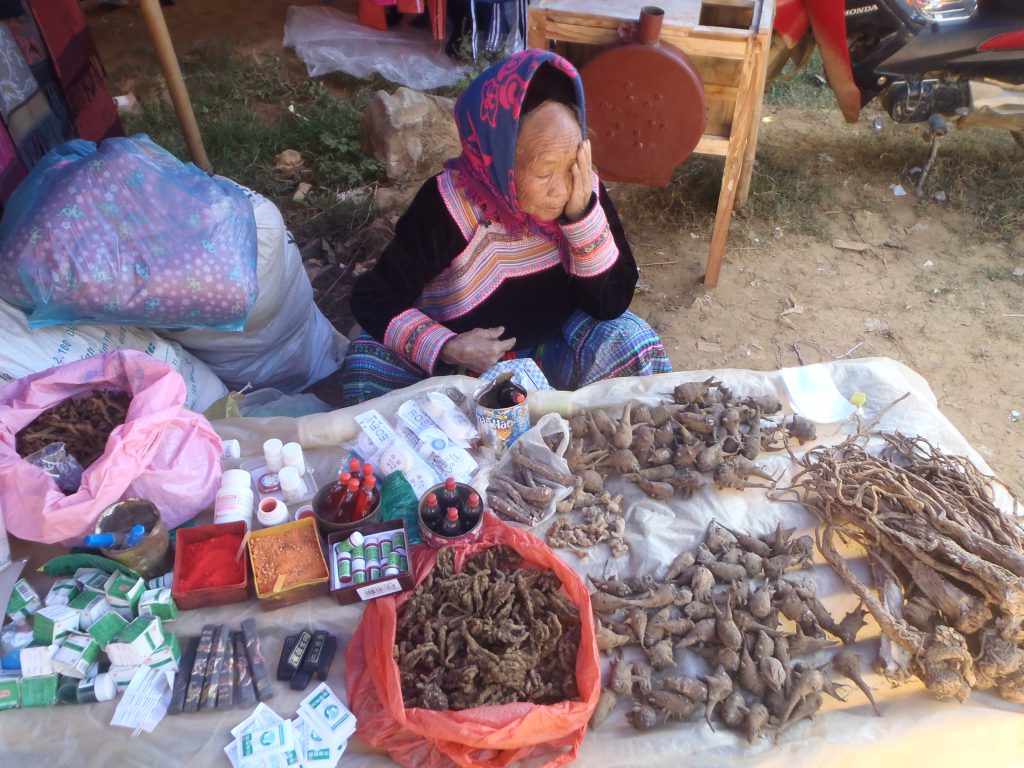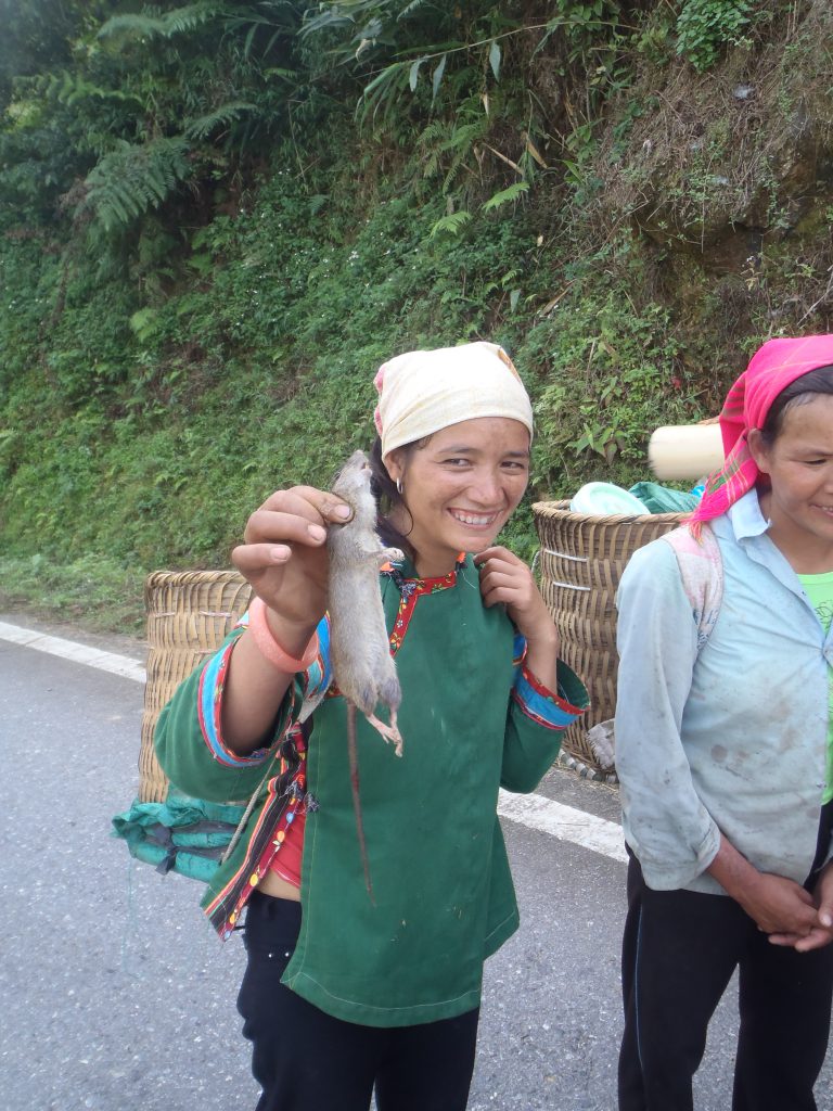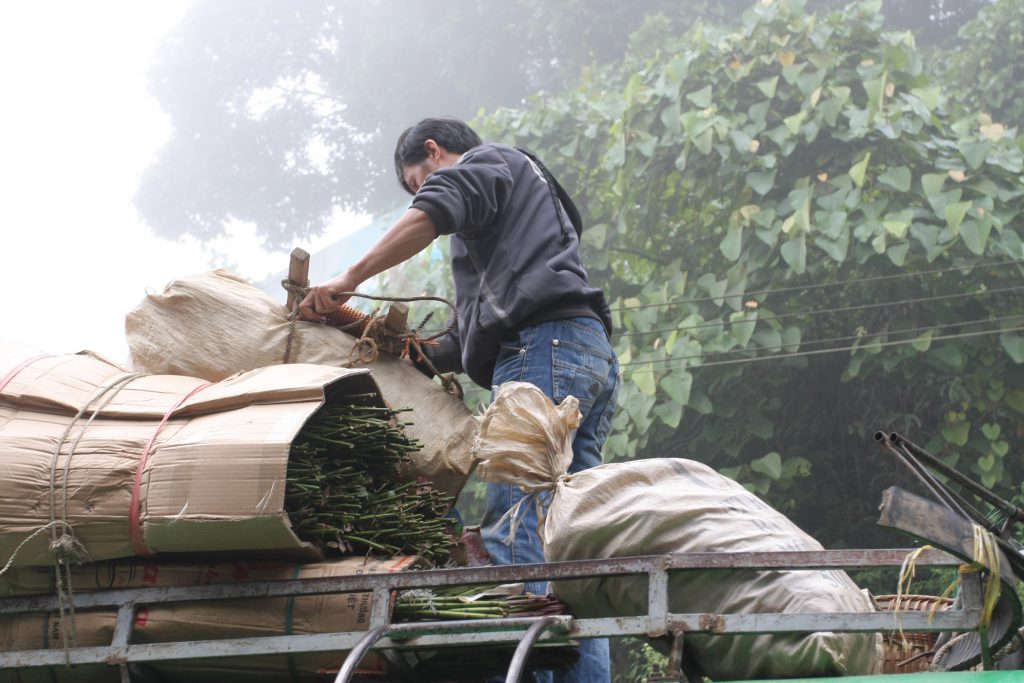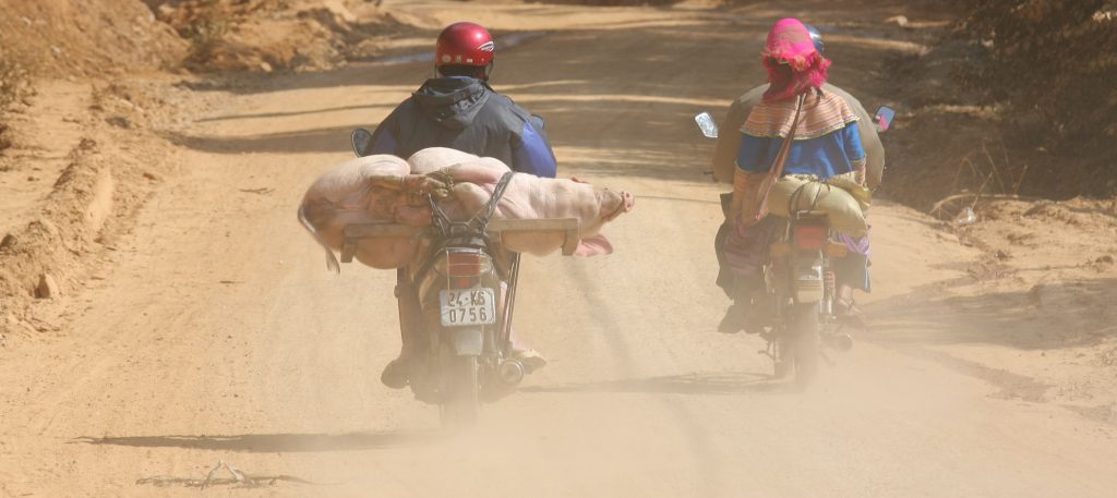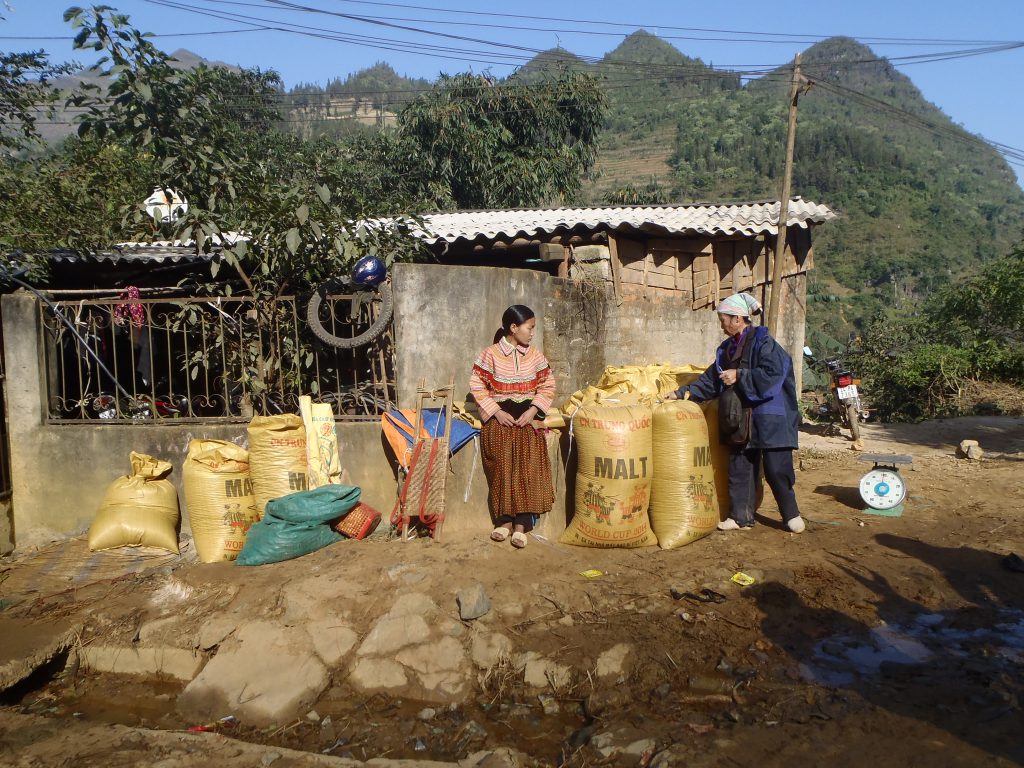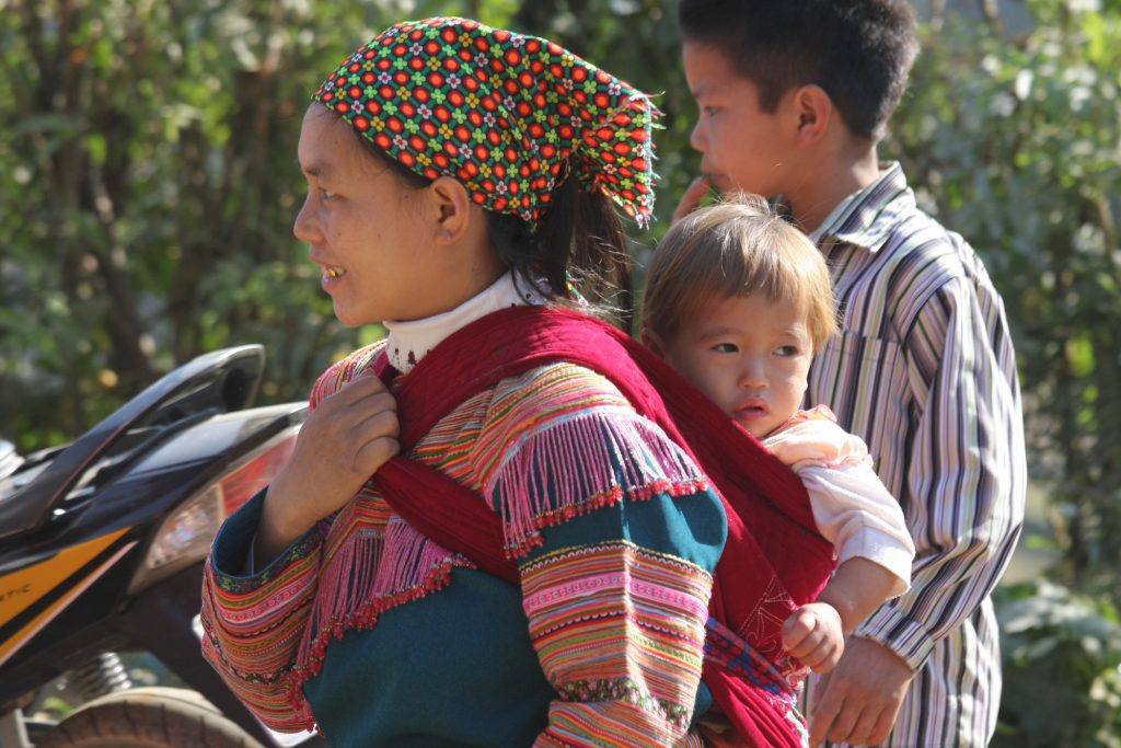 Het is koud op de brommer in de bergen, maar alleen Simeon heeft nog een trui. Wij hebben onze warme spullen al in Maleisië op de post naar huis gedaan en zijn te krenterig om voor een paar dagen een nieuwe trui te kopen. In de straten loopt iedereen met truien en winterjassen, en wij doen het met een T-shirt en een doek. Het motorrijden is heerlijk in deze mooie omgeving en ook Els, wiens rijervaring zich vooral beperkt tot veel achterop zitten en een aantal motorrijlessen geniet van het rijden over de bochtige wegen. Voorzichtig in de bochten en ook in haar tempo kom je er wel. Het is prachtig onderweg. Er gaan brommers richting markt, en er komen brommers alweer terug. Een varken moet even van de brommer af, en erna weer goed vastmaken. Een arend is gekocht, en een soort marmot en een mobiele telefoon. Het wordt steeds drukker met kleurige minderheden, en een enkele toerist en dan zijn we bij de markt van Can Cau. Vogels en koeien kopen is mannenwerk, de vrouwen kopen nieuwe rokken, nieuwe geborduurde kragen en beenstukken en velours stoffen met de felste kleuren. De baby’s zitten is meerdere schitterende doeken gewikkeld op de ruggen van de vrouwen. We genieten van dit kleurrijke spektakel. Dit is waar we in Noord Thailand naar opzoek waren maar dat kan je daar niet meer vinden. Het is al warmer geworden, en op de weg terug is er dan meer tijd om wat onverharde zijweggetjes te nemen. Deze weggetjes leiden naar een dorpje dat iets van de hoofdweg afzit. Niet iedereen rijdt op een brommer rond. Er lopen ook minderheden families langs de kant van de weg met grote stappels takken op hun rug. Als er op een brommer normaal plek is voor 5, kan de jongste met zijn takken wel een stukje met Arjan en Simeon meerijden. Waar we hem weer afzetten kan hij weer een half uurtje rusten voordat de rest er weer is.