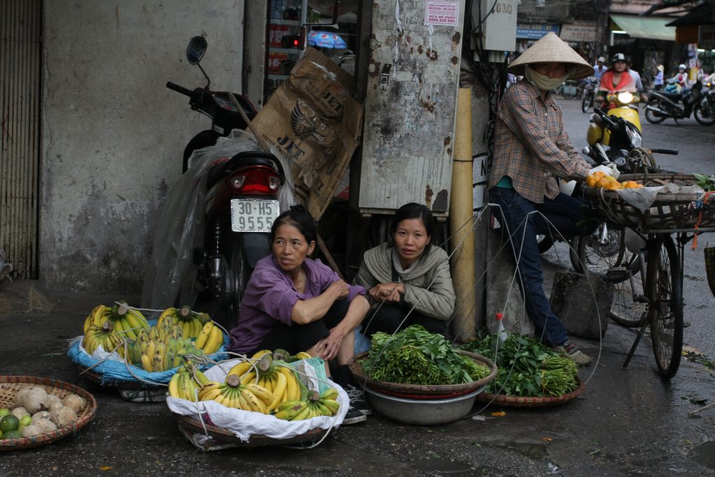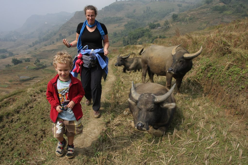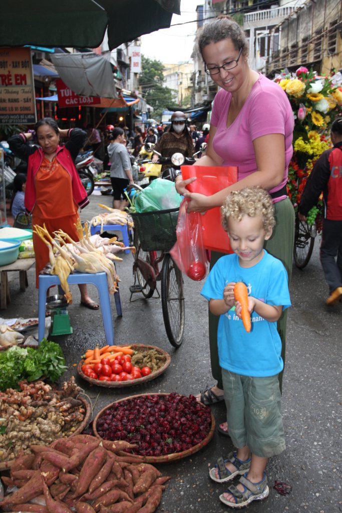 Gelukkig is er de laatste dag weer wat te zien, en het uitzicht hier is prachtig. We lopen de straat uit en worden ingehaald door groepjes andere toeristen met daar omheen groepjes zwarte H´mong vrouwen. Het standaard dingetje om hier te doen is om met de vrouwen naar hun dorp te gaan en dan laten zij hun huis zien. Wie zijn wij om dat ook te doen. Na een paar kilometer lopen staat er een hokje aan de kant van de weg waar er kaartjes gekocht moeten worden om verder te mogen lopen. We hebben helemaal geen zin om nog 5 kilometer naar dat dorp te lopen, en gaan weer terug. Een stukje terug is er een smal pad de berg af, waarvandaan we een prachtig zicht hebben op de vallei en daar boven Sapa. We hopen via deze weg naar Sapa te komen. Over het erf van mensen, door de tuin, langs de hond, over de rand van rijst terrasen, en nog verder dalen we af. beneden aangekomen zien we dat we steeds verder van Sapa zijn afgedwaald. Over een watervalletje klimmen en weer naar boven en nog een paar buffels opzij duwen om op de rand te kunnen lopen. Voor Simeon is 5 kilometer in de bergen lopen wel weer genoeg, en hij weigert nog een stap te zetten. Simeon gaat op Arjan zijn nek verder, en steil omhoog lopend komen we weer bij de weg uit, nu aan de andere kant van de kaartjes hokje. Een prachtige trek langs alles wat we in dit gebied wilden zien. Moe gaan we met de bus naar Lao Cai waarvandaan de nachttrein naar Hanoi gaat. Deze keer niet een coupe van de staatstrein, maar een commerciële aanbieder achter de zelfde locomotief. Het grote verschil met de vorige trein is dat deze schoon is, en dat alles rustig verloopt. Het levert geen spannende verhalen op, maar het is wel lekker na een drukke dag. In Hanoi wachten om 6:00 de taxi’s de toeristen alweer massaal op, maar niemand wil ons op de meter naar een hotel brengen. Alleen voor 60.000 Ðong willen ze on meenemen, en ze slaan 30.000 Ðong of. Uiteindelijk betalen we 16.000 Ðong op de meter, en staan we voor een dicht hotel. We gaan met een gozer mee die op weg naar zijn werk was, en dat is toevallig een hotel. Hij belt wat, en heeft een kamer voor ons. Alleen zijn er meer die die kamer willen, en als we er eenmaal zijn blijken anderen ons voor te zijn. Geen probleem, gratis ontbijt en over 2 uur is een kamer klaar. Alleen twee uur later geen kamer. Uiteindelijk gaan we even een tweepersoons kamer in, douchen we daar en om 11:00 kunnen we eindelijk onze kamer in. Het lijkt een rustig hangochtendje zo, maar Simeon is helemaal kapot, wil niet drinken, wil niet het Sinterklaas journaal kijken, en wil naar eigen zeggen noooooit meer eten. Als Simeon in het hotel instort gaan Arjan op pad om wat inkopen te doen.