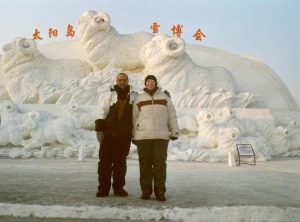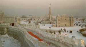 Wij zijn speciaal in de winter voor deze stad naar China gekomen. Ieder jaar is in januari, februari en maart het ijs lantaren festival. Een driehonderd jarige traditie om kaarsjes in uitgeholde ijsblokken te stoppen zodat ze niet uitwaaien is uitgegroeid tot een heel groot spektakel. Het eerste moderne ijslantaren festival dateert uit 1963, en van lieverlee zijn de kaarsjes in de ijsblokken vervangen door gekleurde tl-buizen, en zijn de ijsblokken de bouwstenen van immense bouwwerken. De winkelstraat komt uit bij de Songhua rivier waar de ijsblokken uit worden gezaagd. Op het ijs wordt er met priksleeën en hondensleeën gereden, worden ijsbeelden met verf oranje gespoten en zijn wat kinderen aan het ijstollen.