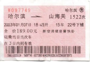 Vanavond nemen we de trein naar Harbin. Het treinkaartje hebben we in het hotel laten regelen. De regelmannetjes vragen een flinke commissie van ¥30 per kaartje, maar dan krijg je wel het treinkaartje waar je om vraagt, en je kunt ondertussen van de stad genieten. Treinkaartjes halen is meestal een vak apart, maar hierover later meer. Hard sleeper, trein T17 wagon 17 plaats 13+14 om 18:20 van Beijing naar Harbin kunnen we van ons treinkaartje begrijpen. Bij de ingang van het station worden we al gecontroleerd of we een kaartje hebben. Op de grote matrixschermen verschijnt opeens T17, met een hoop Chinese karakters erachter, en we volgen de richting die het aangeeft. Bij iedere deur van de trein staat een conducteur te controleren dat je wel in de juiste wagon stapt, en we gooien onze spullen op het bovenste bed. Het gangpad in de wagon is aan één zijde, met daaraan open coupe’s met aan iedere kant drie boven elkaar hangende bedden. Als een chinees tegen ons aan begint te praten, kunnen we uit zijn gebaren halen dat wij het onderste en middelste bed hebben. Na een vriendelijk ‘che che’ (bedankt) denkt iedereen dat we chinees spreken. Een familie wil met ons van bed ruilen. Omdat ze met kinderen reizen hebben ze liever de twee onderste bedden. Uiteindelijk snappen we wat ze bedoelen.