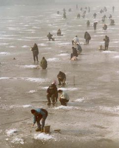 We lopen verder door de stad. In de parkjes zijn chinezen bezig met hun dagelijkse Tai-chi oefeningen, en sommige zijn hun vogeltje aan het uitlaten. Uiteindelijk komen we bij de rivier terecht. Een lange sliert mensen zit midden op de rivier naar een gaatje in het ijs te staren wachtend totdat de hongerige visjes bijten.