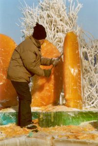 Als de bak vol is, word het hout weggehaald, en kan het beeldhouwen beginnen. Eerst wordt met grof gereedschap de ruwe vorm in de sneeuw gemaakt, en naarmate het bouwwerk vordert, wordt het gereedschap kleiner.