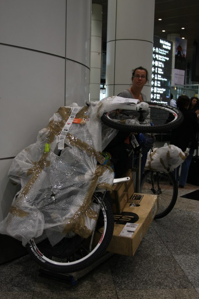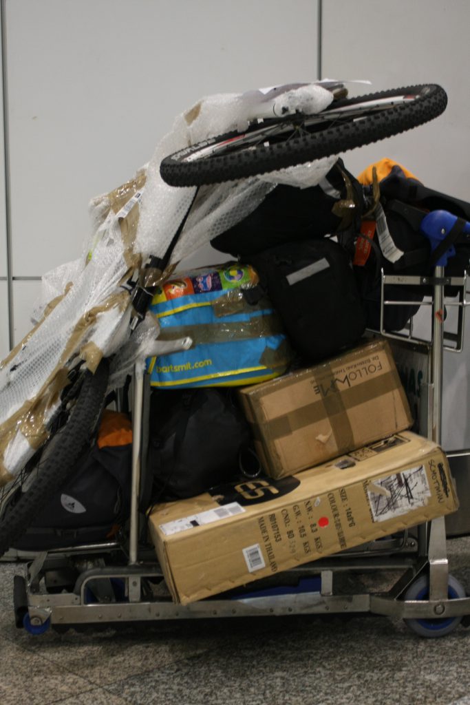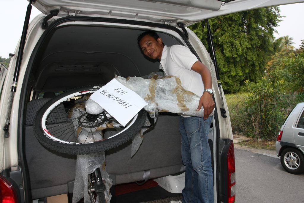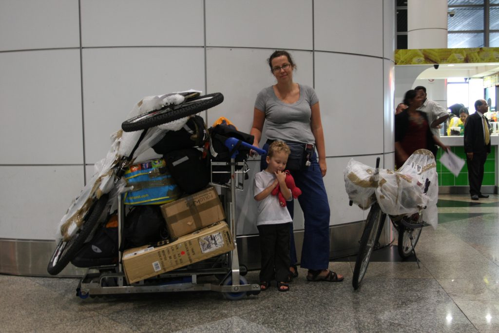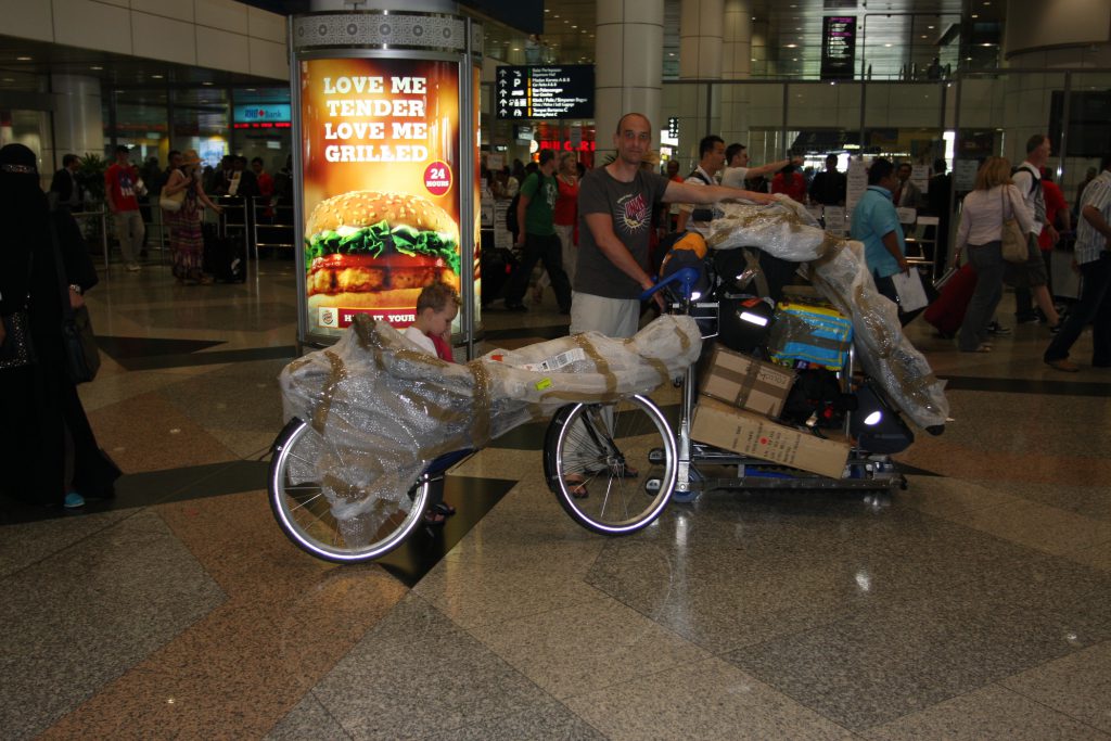 Na een lange dag vliegen merken we dat we niet de enigen zijn die naar Maleisië willen. Anderhalve uur staan we te genieten van andere mensen die ook al uren in een vliegtuig hebben gezeten. Dan zijn we eindelijk aan de beurt om onze vingerafdrukken af te staan, en een foto van ons te laten nemen. Simeon ziet dat de spullen naast de bagageband staan en hij is helemaal ontsteld dat zijn fiets er niet bij staat. Gelukkig staat die aan de andere kant en kan alles op de bagage kar naar buiten.